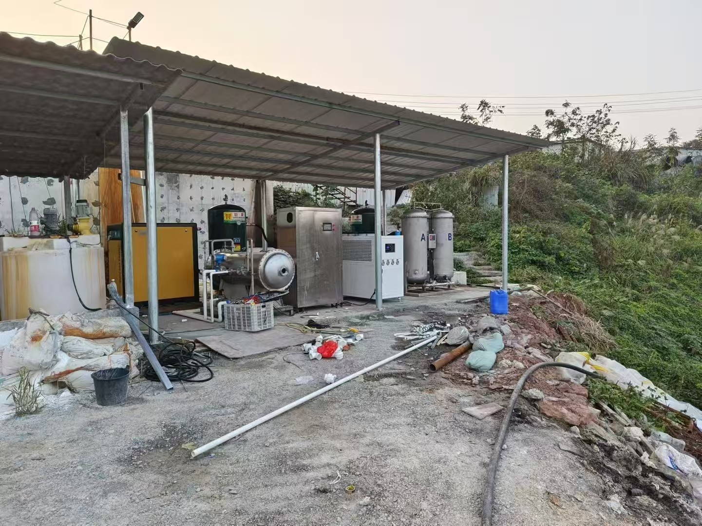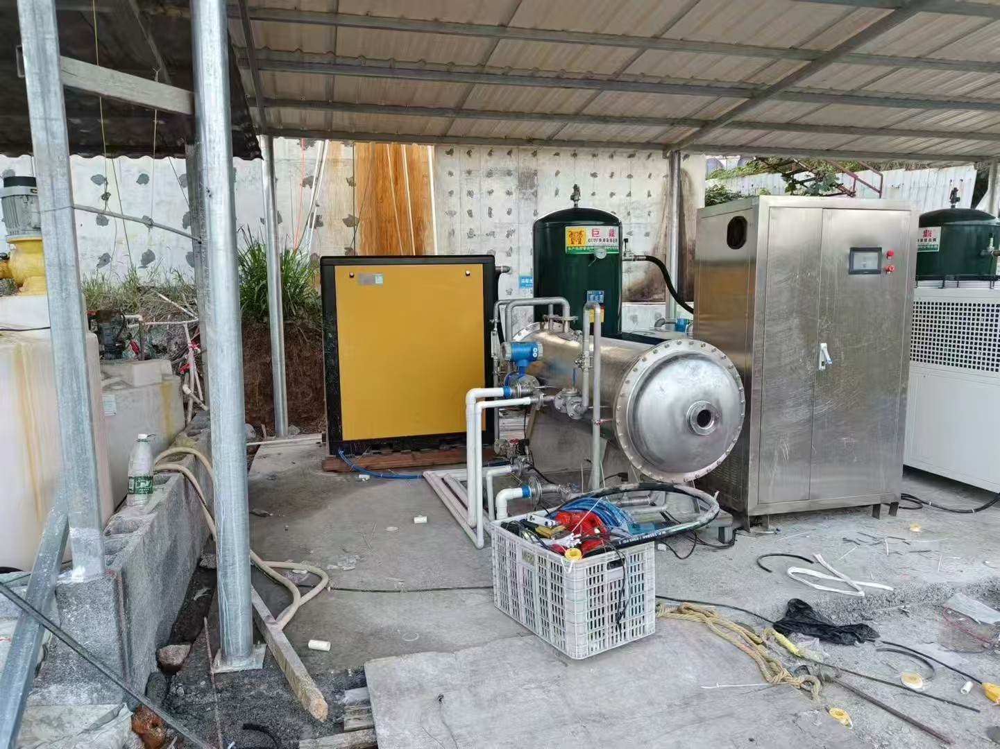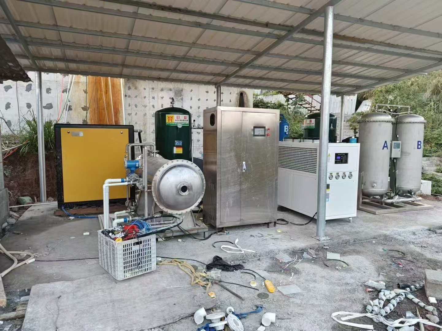 臭氧系統大概配置:臭氧電控柜,2000g/h臭氧機,制氧機,45KW螺桿空壓機,冷干機,吸附干燥機,儲氣罐,恒溫冷水機等。