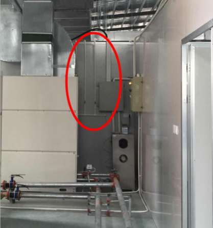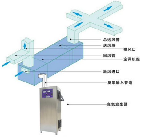 2.4中央空調投加 機器放置在房間外,在中央空調排風管的送風口處開一個小孔,臭氧氣體從小孔通入排風管,然后經過每個房間的風口均勻分布到每個房間中。