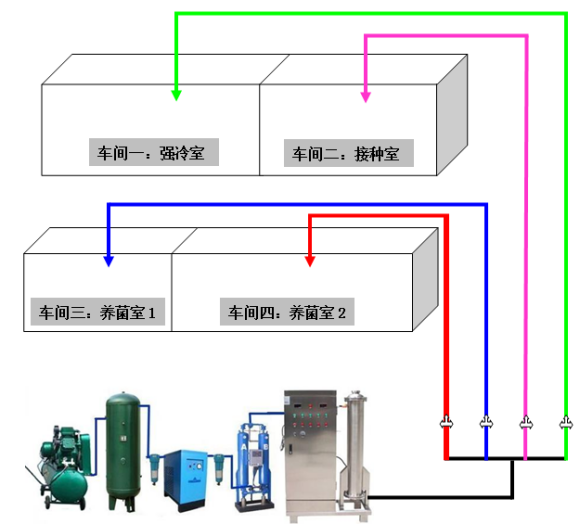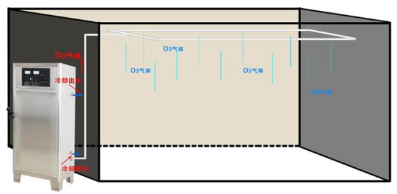 2.3管道噴淋 機器放置在房間外,在車間的頂部、側面墻體或者吊頂層上面,布置PVC/不銹鋼管,在輸送管上間隔開小孔,臭氧氣體從小孔通入各個房間中。