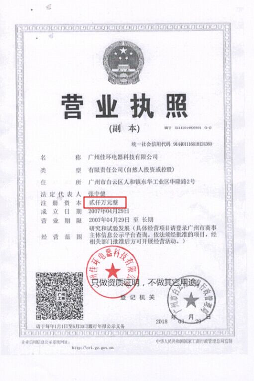 廣州佳環電器科技有限公司注冊資金30萬元正式更改為 2000萬元整。