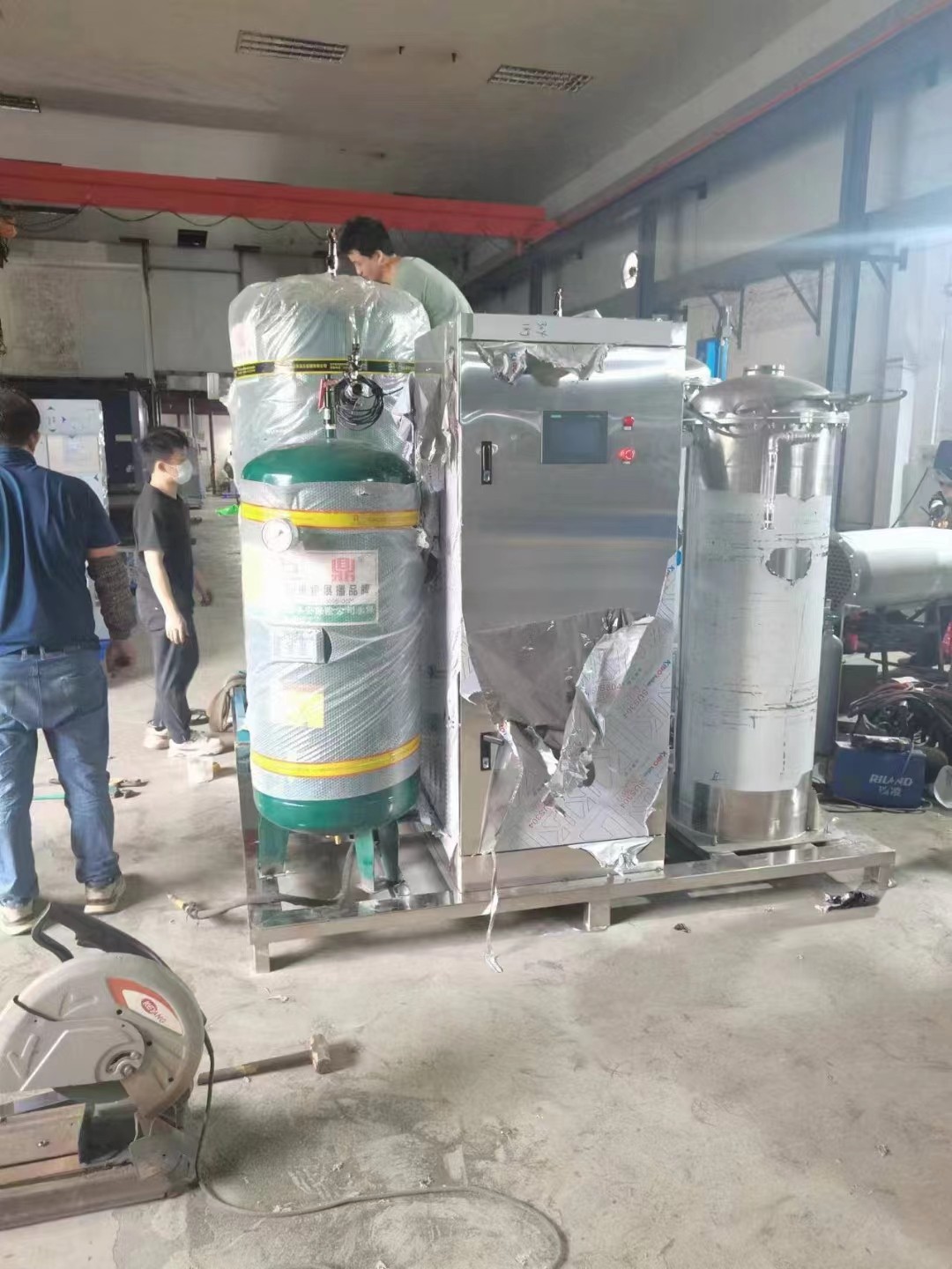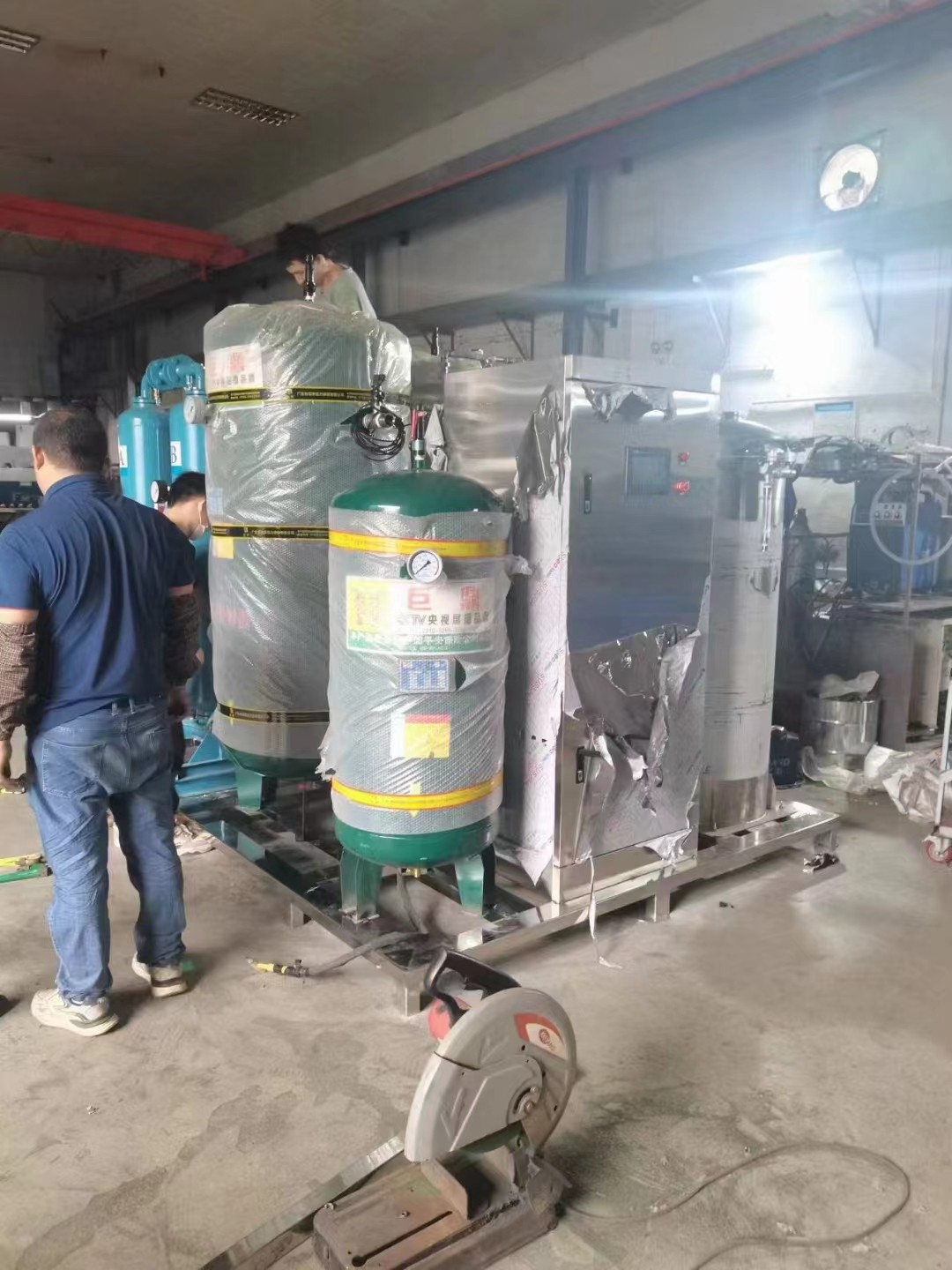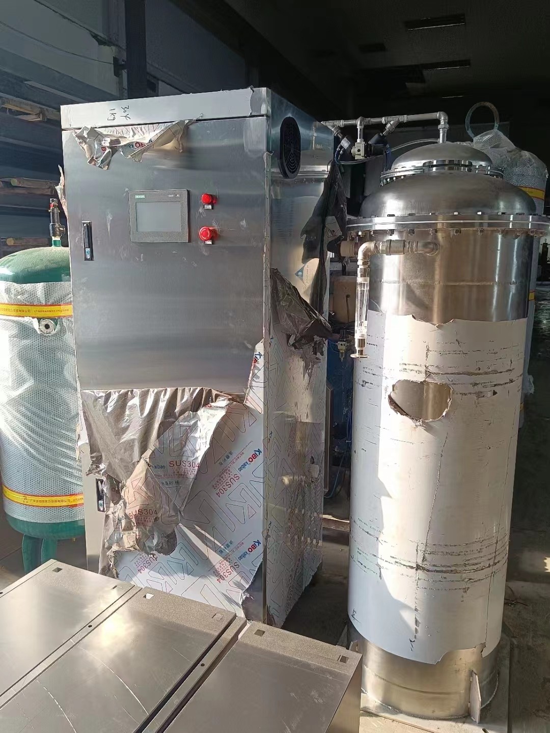 改套設備用于污水高級氧化處理,整套設備包含2KG臭氧發生器,335L制氧機,37KW螺桿空壓機,50P冷干機,吸干機,1.0M3儲氣罐1個,0.3M3儲氣罐2個,6HP冷水機1臺。 臭氧發生器控電柜采用變頻器,發生室內部電級管采用細玻璃管,該設計能讓采用發生器更加穩定高效率的工作,細管的發生管臭氧濃度更高。